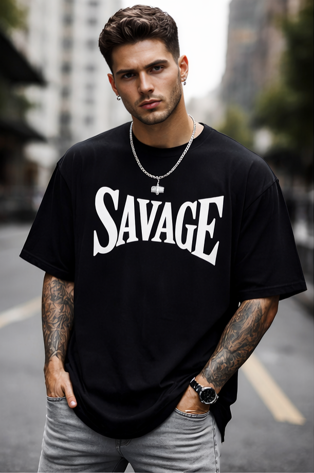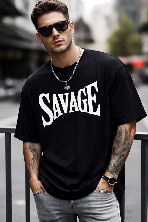 Featuring a bold “SAVAGE” high-contrast white typography print on a deep black base.